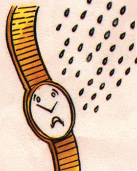 Wipe your watch with a soft cloth if it comes into contact with water and do not wear the watch while taking a shower or in rain.